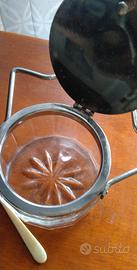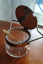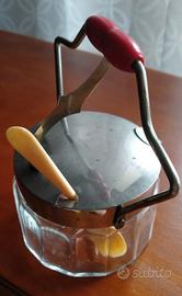 Elegante contenitore vintage anni 40 per formaggio o zucchero. Corpo in vetro sfaccettato con montatura in metallo. Manico con dettagli colorati e cucchiaino abbinato. Coperchio incernierato basculante. Si inserisce in un contesto di arredo tavola retro' o shabby chic.