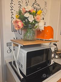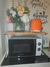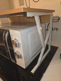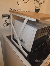 Ottimizza lo spazio nella tua cucina con questa pratica ed elegante mensola da appoggio. Perfetta per posizionare il microonde, il fornetto o altri piccoli elettrodomestici, liberando prezioso spazio sul piano di lavoro. La struttura combina un solido ripiano in legno chiaro con gambe in metallo bianco, offrendo un design moderno e minimalista che si adatta a qualsiasi stile di arredamento. È la soluzione ideale per tenere tutto in ordine e a portata di mano.