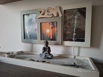 porta foto giardino zen con sabbia bianca, pietre e Buddha in plastica. LxPxA 30x15x30 cm