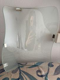 Vendo porta foto in vetro con targhetta in argento, ancora nella sua scatola originale, mai usato, che misura 29,5x25cm.
