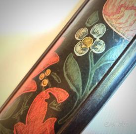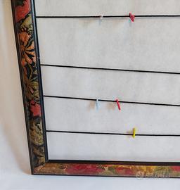Meravigliosa cornice in legno dipinto con motivi floreali trasformata artigianalmente in bacheca portafoto (si possono appendere fotografie grazie a mollettine colorate e corda nera).