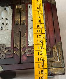 Porta gioie cinese, antico, in legno rosso, intarsi di giada e dettagli in ottone.