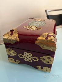 stupendo porta gioie, realizzato interamente in legno negli anni 70 in condizioni perfette con l’interno rivestito in seta rossa, tipica cinese e simbolo di buona auspicio