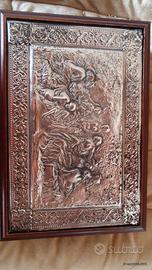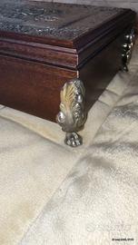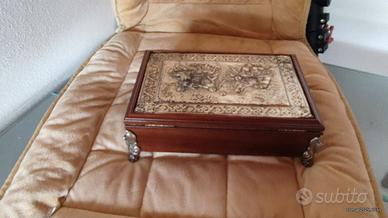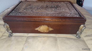Splendido porta gioielli in legno con dettagli in argento lavorato e piedini decorativi. Il coperchio presenta una raffinata scena classica in rilievo, che dona un tocco di prestigio e unicità all’oggetto. Un vero pezzo da collezione o da arredo.