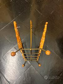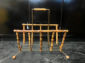 Porta giornali, porta riviste vintage in metallo dorato e segmenti di legno di bamboo.