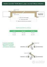 Porte interne Made in Italy - mod. Ecodoor reversibile (è possibile montarle destre o sinistre al momento dell'installazione), in laminato "olmo bianco, grigio e nocciola" (venatura in rilievo orizzontale), nuove, imballate in scatola di cartone, complete di ferramenta, esclusa la maniglia (disponibile a € 15,00). Misure disponibili: cm 210 x 70 e 80 x 10,5 (N.B.: per il montaggio è necessaria una misura luce del controtelaio di cm. 215 x 80 o 90) - telaio con coprifili telescopici fino a cm 12 - disponibile anche la versione scorrevole interno muro completa di maniglia e serratura a € 228,00 (iva comp.) - disponibile la spedizione assicurata in 3, 4 giorni lavorativi (per isole e zone remote: prezzo da concordare) - porte in pronta consegna nel magazzino Kimono Porte di Alessandria, Spalto Gamondio 27