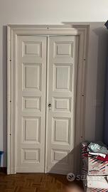 Porta di fine ‘800 in legno massello, a doppio battente con chiambrana, già smontata. Apertura verso l’interno, perfetta anche per una cabina armadio. Chiambrana alta 227cm larga 13cm; porta alta 213cm ante larghe 50cm. Prezzo trattabile.