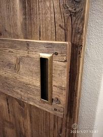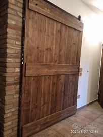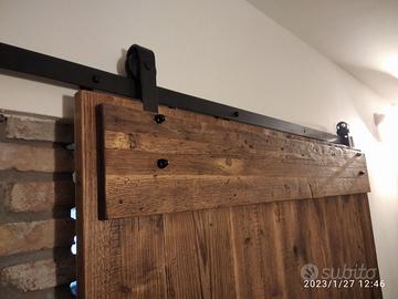 Porta scorrevole sospesa costruita a 3 strati per renderla leggere (interno multistrato esterno cartelle ambo i lati in legno vecchio) e in modo che non si muova nel tempo, in legno di ABETE VECCHIO RECUPERATO DA TRAVI E PARANCOLE DA MURATORE E SOLAI con misura lunghezza 150 spessore 2,4 + traversi orizzontali da 2,4 cm h 225, con tavole verticali come richiesto dal cliente esterne escluso maestà, maniglia ad incasso per apertura e chiusura completo di finitura cerata leggermente scura come foto. I traversi orizzontali applicati con testa di chiodo arrugginita (come nel restante delle porte esistenti). Scorrerà su binario in ferro FINITURA NERO OPACO STANDARD ammortizzato in chiusura e apertura, sistema di antisgancio e fermi esterni, sotto applicato squaletto per mantenerla in sede. Il tutto finito e carteggiato e levigato in modo che sia morbido al tatto e finitura cerata tinta noce medio. Una volta confermato verrà fatto disegno cad in 3d per dare proporzioni e fattezza del tutto. è già stata costruita e venduta su commissione di conseguenza non teniamo magazzino ma essendo NOI i diretti costruttori li facciamo noi con le nostre mani siamo in grado di soddisfare qualsiasi richiesta. il prezzo si intende franco fabbrica compreso finitura su porta e su ferro finitura, non comprendente di iva. per domande o dubbi contattateci P.S. eseguiamo MOBILI SU MISURA sempre con legno di abete antico o altro. per noi conta dare vita al vostro sogno DIRETTAMENTE DAL PRODUTTORE. ASTENERSI RIVENDITORI E COMMERCIANTI