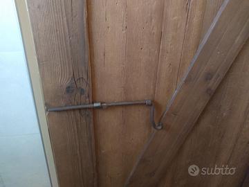 Porta sospesa scorrevole costruito in legno vecchio recuperato da travi parancole e solai antichi con misura lunghezza 103 spessore 4,5 cm h 220 costruita come vs foto in legno vecchio e la porta scorrerà su binario in ferro con carrucole e fissato direttamente a muro con relativi distanziali e carrucola scorrerà su cuscinetti, telaio con spessore 4,5 cm mentre pannello interno da 3,5 in modo da dare risalto al salto di quota con fascia trasversale e con testa di chiodo applicata frontalmente, applicazione catenaccio per apertura. squaletto parte sotto per tener in sede nello scorrimento la porta. completo di finitura effetto grezzo naturale trasparente impermeabile (leggermente scura come richiesto dal cliente altrimenti si può lasciarla al grezzo o cerata) escluso maestà e mostrine, Il tutto finito e carteggiato e levigato in modo che sia morbido al tatto, è già stata costruita e venduta su commissione di conseguenza non teniamo magazzino ma essendo NOI i diretti costruttori li facciamo noi con le nostre mani siamo in grado di soddisfare qualsiasi richiesta. il prezzo si intende franco fabbrica compreso finitura su porta e su ferro finitura simile arrugginita, non comprendente di iva. per domande o dubbi contattateci P.S. eseguiamo MOBILI SU MISURA sempre con legno di abete antico o altro. per noi conta dare vita al vostro sogno DIRETTAMENTE DAL PRODUTTORE. ASTENERSI RIVENDITORI E COMMERCIANTI