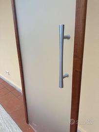 Porta artigianale, in vetro satinato scorrevole, con profili in legno ciliegio, completa di guida e mantovana in legno come i profili, maniglione in acciaio. Ottime condizioni