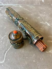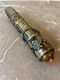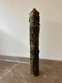 Vendo set completo: - Porta incenso in stile buddista (decorativo e funzionale) - Incenso Gangchen Himalayan Healing – originale del Nepal. - Dimensioni: altezza 23 cm; 2,8 cm di larghezza del cilindro; larghezza di base 3,2 cm L'incenso è quello nella foto (confezione con indirizzo in Nepal: Bouddi, Tinchuli, Kalimani). Profumo naturale, usato per meditazione, healing, yoga o semplicemente per creare un'atmosfera rilassante. - Porta incenso come nuovo - Incenso mai usato - Perfetto per chi cerca un oggetto autentico, non banale Lo vendo perché non lo utilizzo più / mi è stato regalato e non mi serve. Per qualsiasi altra informazione, scrivimi.