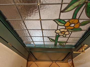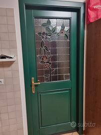 Vendo porta interna in legno verniciato verde con vetro piombato artistico floreale. Il vetro è integro, senza crepe o rotture; il piombo è leggermente danneggiato e un po’ traballante in alcuni punti, ma nel complesso stabile. In basso a destra manca un tassello originale di vetro, sostituito con vetro lucido.