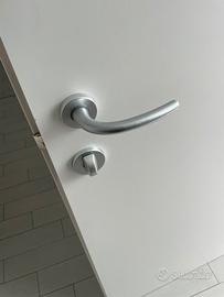 1 Porta da interni laccata bianca completa di coprifili e maniglie satinate. Ha un sistema di sicurezza (apertura / chiusura) che puó essere sostituito da una serratura. La porta era montata in un negozio suddiviso in cabine. Non presenta difetti. Le misure sono 80 x 210. Si richiede il ritiro in loco. Già smontata e imballata.