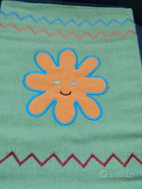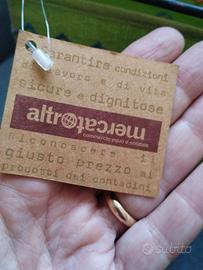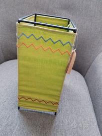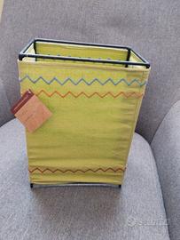Porta lampada in tessuto e metallo Altromercato Nuova con etichetta. (lampadina non inclusa) Etnica e Allegra – Commercio Equo e Solidale (Altromercato) Dimensione 25 x 18 x 12 cm Ideali per un comodino, una scrivania o una mensola. Il paralume è di forma rettangolare/quadrata. Porta un raggio di sole e colore nella tua casa con questa adorabile lampada da tavolo in tessuto! Perfetta per una camera da letto, la stanza dei bambini, o per aggiungere un tocco allegro e boho-chic a qualsiasi angolo della tua zona giorno. Design Unico: Realizzata con un paralume in tessuto di colore verde lime/pistacchio molto fresco e vivace. Presenta deliziose cuciture ricamate a zigzag in colori a contrasto (azzurro, arancione, rosso/bordeaux) sia nella parte superiore che inferiore, che donano movimento e un tocco artigianale. Dettaglio Centrale: Al centro, un'irresistibile applicazione ricamata a forma di sole arancione con un contorno azzurro e una simpatica faccina sorridente. Impossibile non sorridere guardandola! Origine Etica: Questa lampada è un prodotto di Commercio Equo e Solidale (Altromercato). Come mostrato nel dettaglio del cartellino ancora attaccato, l'acquisto garantisce condizioni di lavoro e di vita sicure e dignitose e il riconoscimento del giusto prezzo ai contadini/artigiani. Un acquisto consapevole che fa del bene! ❤️ Struttura: Solida struttura in metallo nero (ferro battuto stile etnico) che fa da base e cornice al paralume. È leggera e stabile. Condizioni: Ottime, come nuova! Come si vede dalle foto, è ancora presente il cartellino originale. Non è mai stata usata come lampada principale. Funzionalità: Attacco per lampadina (non inclusa). L'interno è pulito e la struttura elettrica sembra integra. E' più di una semplice lampada: è un pezzo unico ricco di personalità e colore, che diffonde non solo luce, ma anche allegria e valori importanti! È anche un'ottima idea regalo per chi ama lo stile etnico, colorato o per arredare