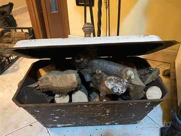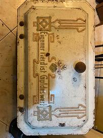 Cassetta porta legna o carbone dei primi del 900 di origine tedesca. Il coperchio decorata con tecnica smaltata/ceramicata riporta il testo "Eigenes Herd ist Goldes Wert", le condizioni sono quelle da foto, possibilità di spedizione.