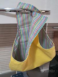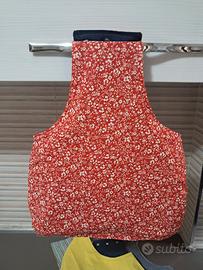 Porta mollette artigianale in tessuto jeans( no riciclato, tessuto a metraggio)e cotone. Tutti interamente foderati con stoffa in cotone ,questa da la possibilità di diventare dubleface. In cari colori, ( come nella foto).