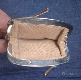 porta monete in tessuto di corda colore avorio e pelle martellata tinta rossa struttura di chiusura arcata in metallo cromato con chiusura a clips interno in tessuto di corda, nella parte centrale lo stemma in porcellana bianca Napoleon con corona superiore e ghirlande di fiori laterali, lo stemma manca di un piccolo pezzettino laterale vedi foto, mai usato da collezione, misura altezza compresa la clips cm 14, larghezza cm 10,8, profondità interna cm 10, oggetto di rara reperibilità.