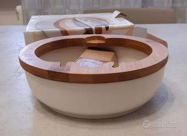 Ciotola portanoci in porcellana con supporto in bamboo e schiaccianoci in metallo cromato. Linea Brandani.