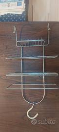 mensola per doccia in acciaio con gancio tipo stampella. 2 ripiani. qualche deposito di calcare rimovibile. no ruggine