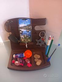 Pratico organizer da tavolo, in legno, marca Teslyar: porta cellulare con foro per cavo da ricarica; portapenne; portamonete; portachiavi; porta occhiali e quant’altro. Misure: l.23xp.20xh.19 #portacellulare #portaoggetti #portaocchiali #organizer #regalouomo #regalodonna