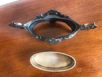 Scenografico grazioso porta oggetti, o porta gioie realizzato a mano in ferro battuto, dotato di vaschetta interna ovale che all'occorrenza può essere rimossa. Dimensioni 13x35x17