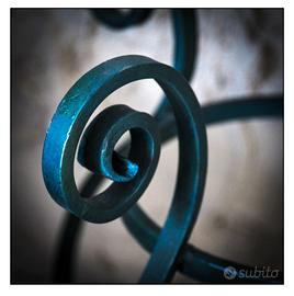 Porta ombrelli in ferro battuto fatto a mano (dal sottoscritto) le volute superiori e inferiori terminano con un finale a coda di pesce, la coppa alla base di lamiera sbalzata è fissata con chiodo.