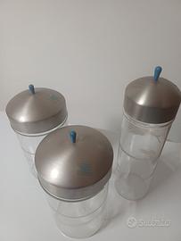Tre pezzi, in vetro, con coperchio in alluminio.