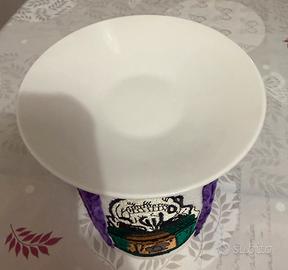 Fatto con macchina da ricamo con varie immagini e' alto15 cm all'interno c'è un bicchiere di plastica alto 8 cm come base c'è un piattino da caffè