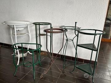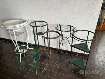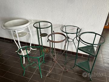 I pezzi mostrati sono sei porta-piante (o supporti per vasi), prevalentemente in metallo (ferro battuto o tubolare), in stile vintage o rustico.