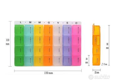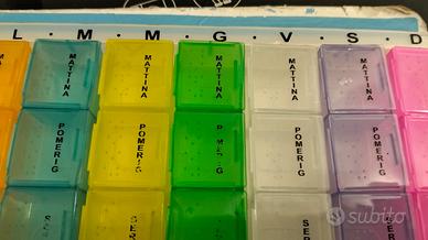 porta pillole suddiviso per colore , per giorni della settimana e per periodi del giorno. Utile per anziani.
