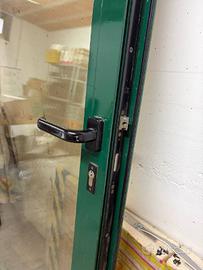 Vendo porta di alluminio con vetro a specchio, profilo verde scuro.