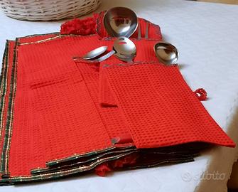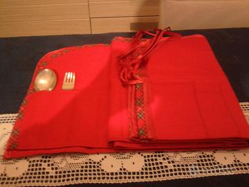 PORTA POSATE in stoffa rossa rifinita con nastro colorato. N.6 contenitori per completo posate, 12 forchette, 12 cucchiai, 12 coltelli, 12 cucchiaini da caffe o dolce, 12 forchettine e 12 coltellini. Prezzo € 12 Proposta rimasti n.2 euro 20. Potrebbe essere anche una bella idea regalo ad un amica