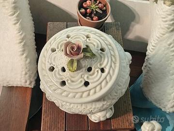 Delizioso porta pot-pourri in porcellana, riccamente decorato con motivi floreali e dettagli in rilievo.