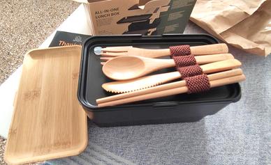 AMICO DEL PIANETA - Il coperchio in bambù e le posate in legno sono realizzati con materiali biodegradabili e sostenibili. La scatola porta cibo, invece, è riciclabile al 100%.