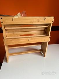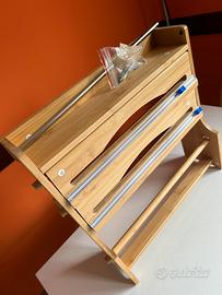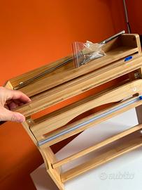 Portarotoli da Cucina con sistema di taglio. Dispenser a Muro o in appoggio su piano. Portarotoli Carta, Alluminio, scottex e pellicola. C’e il piano sopra per riporre i porta spezie. Misure 40x40x11,5 cm, Bambù naturale Nuovo, mai usato.