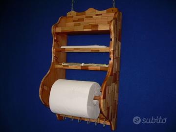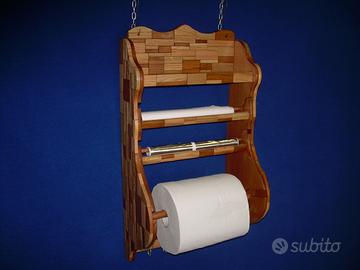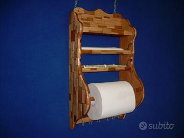 Porta rotoloni a parete con altre due posizioni di rotoli, realizzato sia nella forma che dalla lavorazione strettamente artigianale, con rivestimento di tasselli di legno di varie essenze, mantenendo i colori naturali, pezzo unico. Sopra un ripiano e sotto si possono agganciare ganci per appendere oggetti di cucina. Misure alto cm 70, largo cm 39, profondo cm 23.
