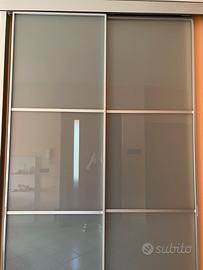 Porta scorrevole esterno muro in vetro temperato opaco Binario e profili satinati 2 ante cm. 90 altezza 3 m. Chiusa cm.180 h.3 m. Piantone laterale spess. cm. 10 largh. cm.5
