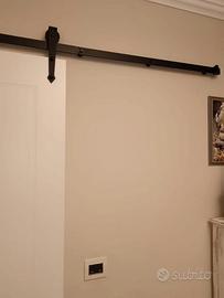 Sistema porta scorrevole stile Barn Door (porta americana) completo di anta in legno bianco e binario in ferro nero.