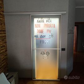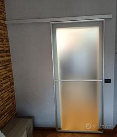 Vendo porta scorrevole per cabina armadio, e non solo, con telaio alluminio spazzolato e vetro satinato. Le misure sono h 230 x 100 cm. La porta è completa di guida superiore, con fissaggio a parete, in alluminio spazzolato lungh. 200 cm.