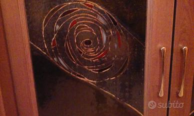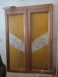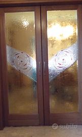 Porta scorrevole 2 ante legno massello con vetro con rifiniture in oro, compresa di telaio e mostre in perfette condizioni.