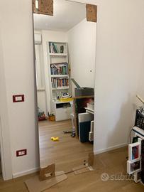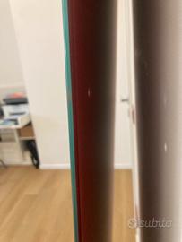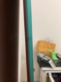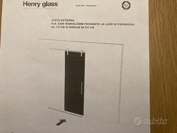 Porta scorrevole in vetro temperato Henry Glass, con maniglione e binario in acciaio cromato compresi. Misure 76x210cm, spessore 1cm (con doppio maniglione l’apertura si riduce di 5/6cm) La porta ha una facciata a specchio ed una rossa