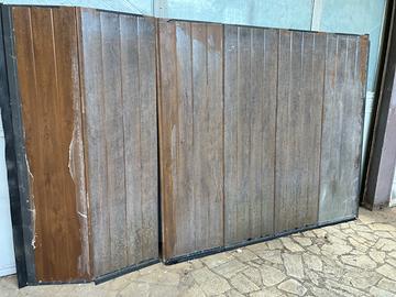 Porta sezionale a scorrimento laterale, pannelli coibentati doppia parete in lamiera da 4.2 cm , finto legno ( all’esterno il sole ha opacizzato la pellicola) completa di tutti gli accessori, e motorizzazione a traina .