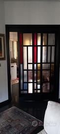 Porta scorrevole a due vie con vetri a formelle stile cattedrale, raffigurante lo stile pittorico di Piet Mondrian Struttura laccata nera Misure larghezza totale cm 156 (un pannello cm 73) - altezza cm 225 Non spedisco, ritiro a Torino