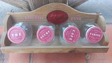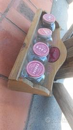 Vendo porta spezie da appendere, in legno, con ganci e 4 vasetti in vetro.