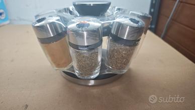 Porta spezie girevole, aperto solo per le foto. Nuovo. Possibilità di ricaricare o sostituire il contenuto dei barattoli.
