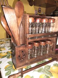 Set porta spezie con 8 vasetti in vetro e tappo in legno, 4 mestoli in legno, blocco notes e matita, porta rotolo per scottex nella parte sottostante da appendere. Nuovo.