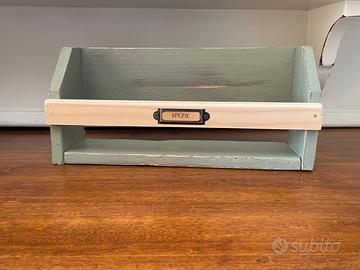 Portaspezie artigianale realizzato in legno, dipinto in verde salvia e rifinito con frontale in legno naturale. Il porta‑etichetta in metallo con scritta SPEZIE aggiunge un tocco rustico e autentico Ideale per aromi, erbe, spezie e miscele fatte in casa Pezzo unico, fatto a mano, perfetto per cucine rustiche o moderne