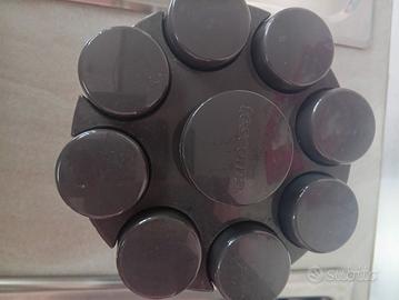 vendo porta spezie girevole moderno di cui 8 barattolini + piccolo imbuto al centro come nuovo a soltanto un tappo ke nn si chiude bene ma si trova colore nero prezzo 9€