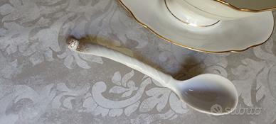 Porta sugo/salsa da tavola (ciotola e base sono un tutt'uno). Provvisto di relativo cucchiaio. Porcellana marchio Kpm Germany bianca con filo d'oro.
