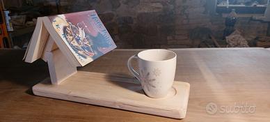 Porta tazza con supporto per libri realizzato in abete con inserti in noce.
